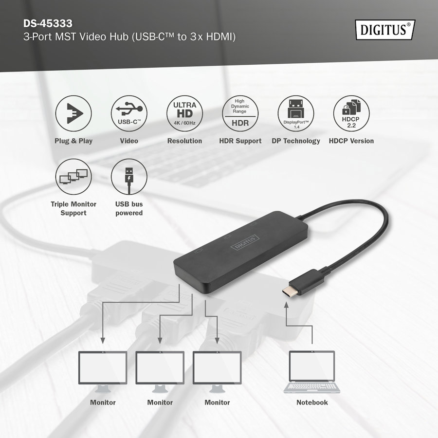 Koncentrator MST marki DIGITUS wykorzystuje technologię Multi Stream Transport (funkcjonalność DisplayPort 1.2), która umożliwia przesyłanie kilku sygnałów AV za pomocą jednego kabla. Umożliwia to korzystanie z kilku monitorów podłączonych za pośrednictwem konfiguracji koncentratora MST. Koncentrator MST może rozdzielać różne strumienie wideo na trzy podłączone wyświetlacze. Zasadniczo obsługiwane są trzy tryby odtwarzania: Kopia lustrzana ekranu (1 sygnał powielany na 3 wyświetlaczach), rozszerzanie pulpitu (3 sygnały na 3 wyświetlaczach), rozdzielenie (1 sygnał rozdzielony na 3 wyświetlacze.