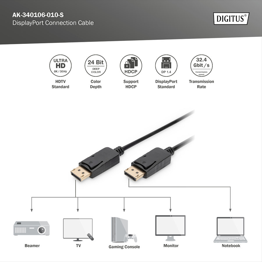 Kabel DisplayPort 1.4 8K@60Hz M/M 3,0m Digitus AK-340106-030-S