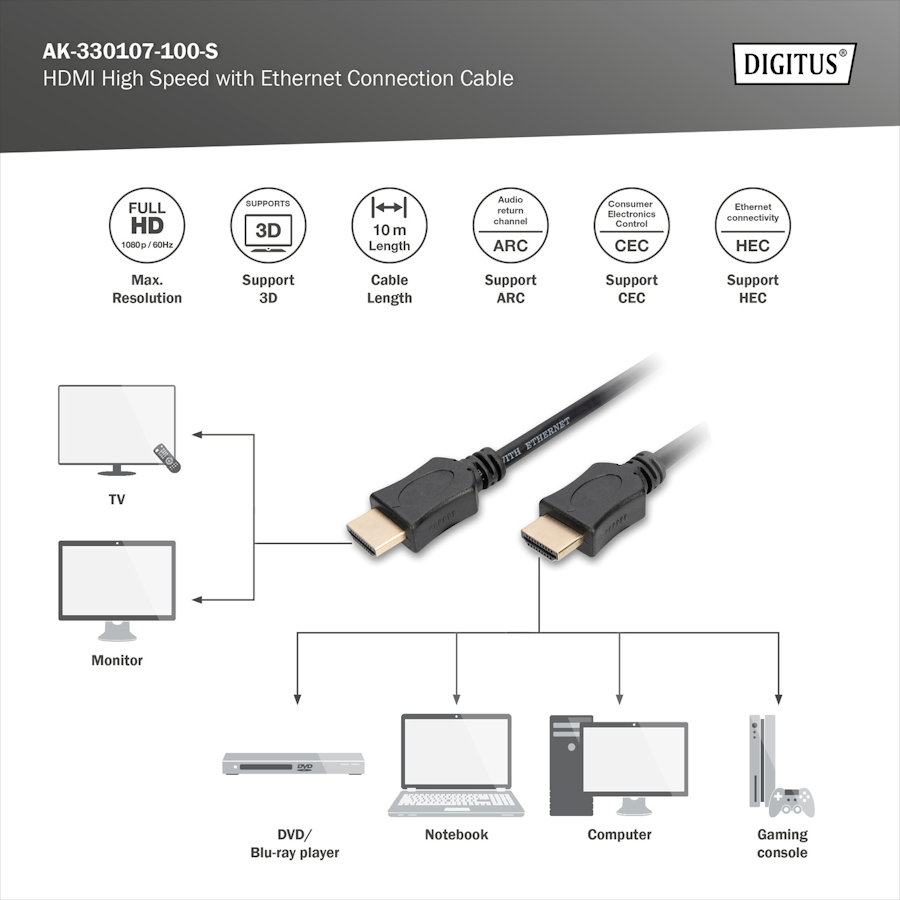Kabel połączeniowy HDMI 1.4 High Speed Ethernet 1080p60Hz FHD Digitus model AK-330107-100-S