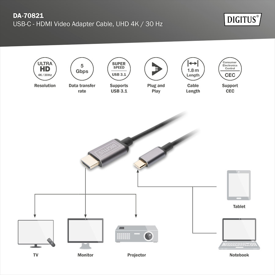 umożliwia podłączenie monitora, rzutnika lub telewizora do portu USB-C w notebooku lub tablecie. Nie są potrzebne żadne dodatkowe adaptery. W zależności od urządzenia źródłowego kabel ten obsługuje rozdzielczości do 4K/30 Hz włącznie z obsługą 3D i ARC. Kabel ten obsługuje także transmisję danych z prędkością do 5 Gbps oraz funkcje USB 3.1. Oszczędzaj na dodatkowych adapterach lub konwerterach i używaj kabla adaptera DIGITUS USB-C do HDMI.