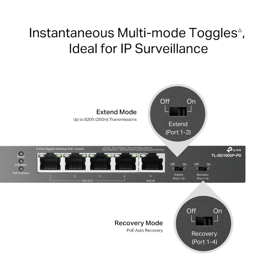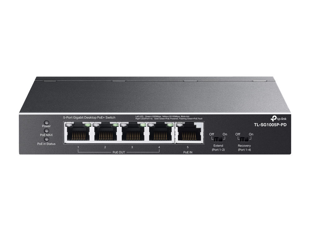 Przełącznik PoE+ typu Desktop 5 portów gigabitowych w tym 1 port PoE++ IN i 4 porty PoE+ OUT TP-Link model TL-SG1005P-PD